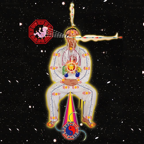 Dieser Vorzustand oder Urhimmel wird Hundun genannt, die ursprüngliche Chaos-Einheit, die dem „Urknall“ des aufbrechenden kosmischen Eies vorausging. Die drei Ursprünge (San Yuan) des Himmels, der Erde und der Menschheit sind in den drei Körperkesseln als Ur-Jing, Ur-Qi und Ur-Shen versammelt. Dieser dreitönige harmonische Akkord schwingt mit dem Grund- oder Urton von Zeit und Raum mit. Das Bewusstsein stabilisiert sich dann im axialen Zentrum, wo unsere wahre multidimensionale Natur nun verkörpert werden kann. Dies wird durch einen tonalen Doppelwirbel symbolisiert, der sich schneller als die Lichtgeschwindigkeit in der Leere des Raums dreht. Darin ist das unsterbliche Licht unseres inneren Weisen eingeschmolzen.